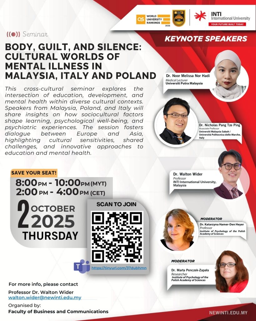 Zapraszamy na seminarium „Body, guilt, and silence: Cultural worlds of mental illness in Malaysia, Italy and Poland”, podczas którego trójka badaczek i badaczy z Malezji przedstawi swoje referaty.