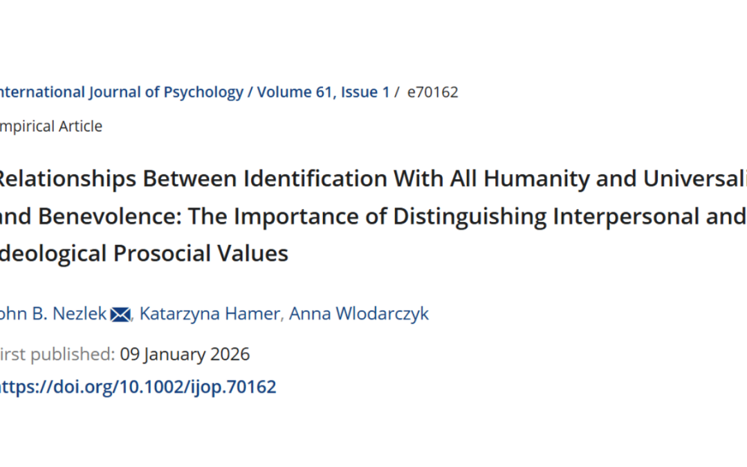 Opublikowany w International Journal of Psychology wraz z dr hab. Johnem Nezlekiem, prof. USWPS i dr Anną Włodarczyk, artykuł prezentuje wyniki trzech badań przeprowadzonych w Stanach Zjednoczonych (n = 598), Polsce (n = 1000) i Chile (n = 311). W badaniach mierzono identyfikację z całą ludzkością (IWAH) oraz poparcie dla wartości uniwersalistycznych i dobroczynnych (z ang. benevolence), zgodnie z definicją Schwartza i współpracowników. We wszystkich trzech badaniach, wyniki IWAH były istotnie (pozytywnie) powiązane z poparciem wartości uniwersalistycznych i nie były istotnie powiązane z poparciem wartości dobroczynnych. Wyniki te potwierdzają niedawny model prospołeczności Nezleka (2022), który rozróżnia prospołeczność ideologiczną (związaną z wartościami uniwersalistycznymi) i interpersonalną (związaną z wartościami dobroczynnymi). Chociaż zarówno uniwersalizm, jak i dobroczynność są wartościami prospołecznymi, odnoszą się do różnych dziedzin prospołeczności: odpowiednio ideologicznej i interpersonalnej. Autorzy pokazali, że a IWAH jest powiązane z tą pierwszą, ale nie z drugą.