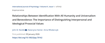 Na początku roku ukazał się kolejny artykuł we współautorstwie dr hab. Katarzyny Hamer, prof. IPPAN: Relationships Between Identification With All Humanity and